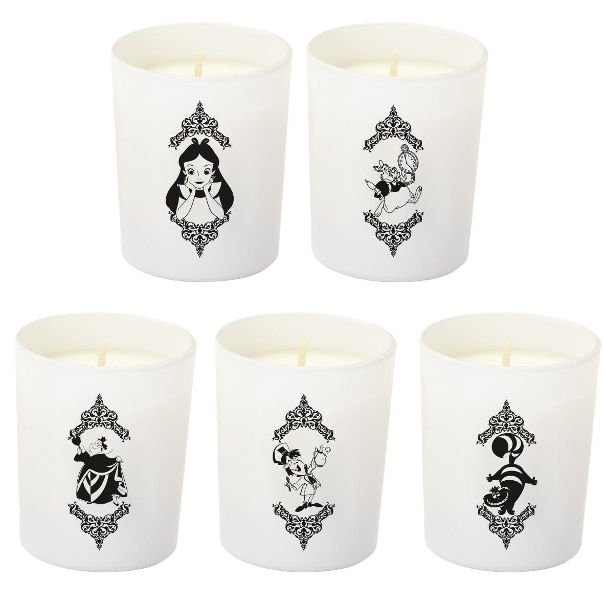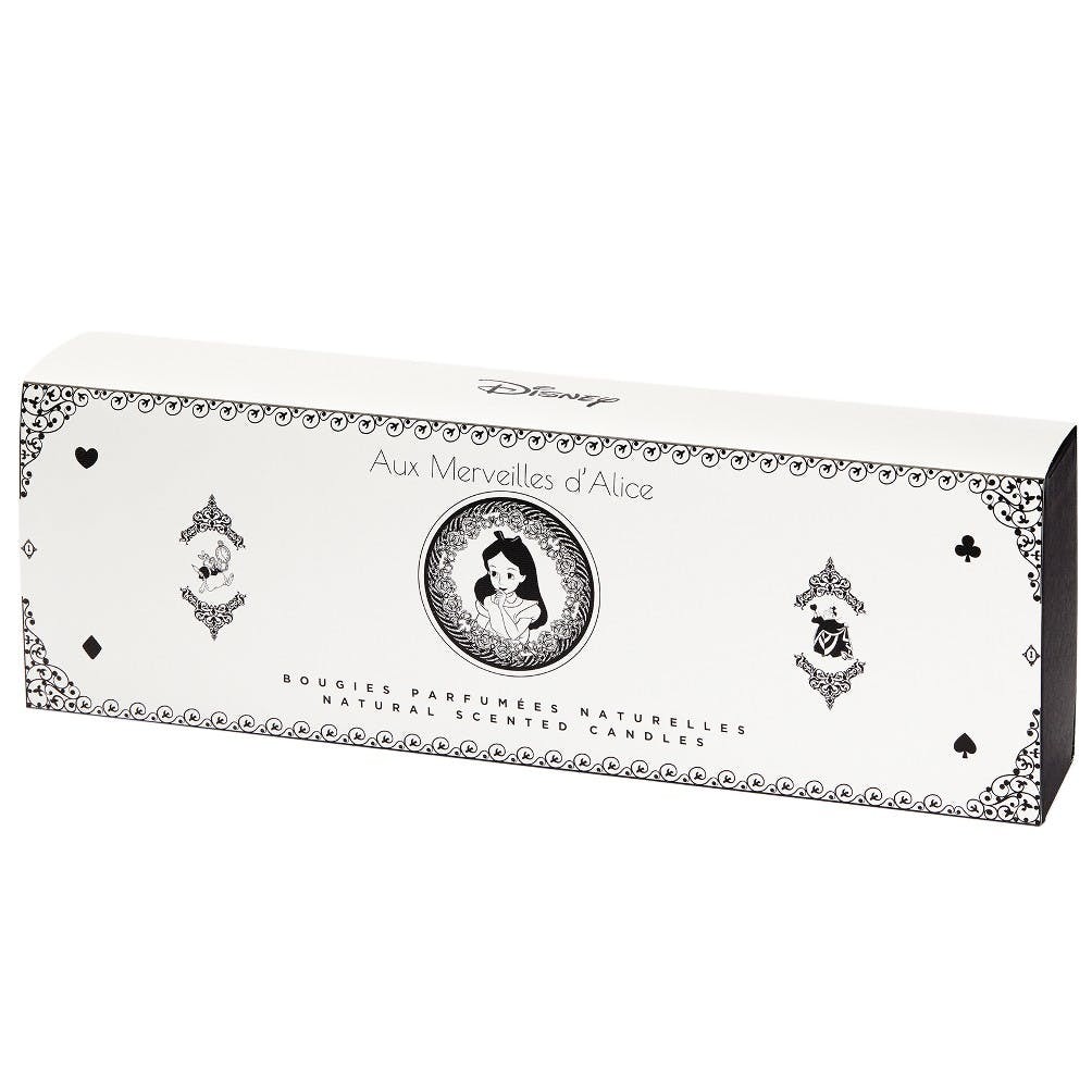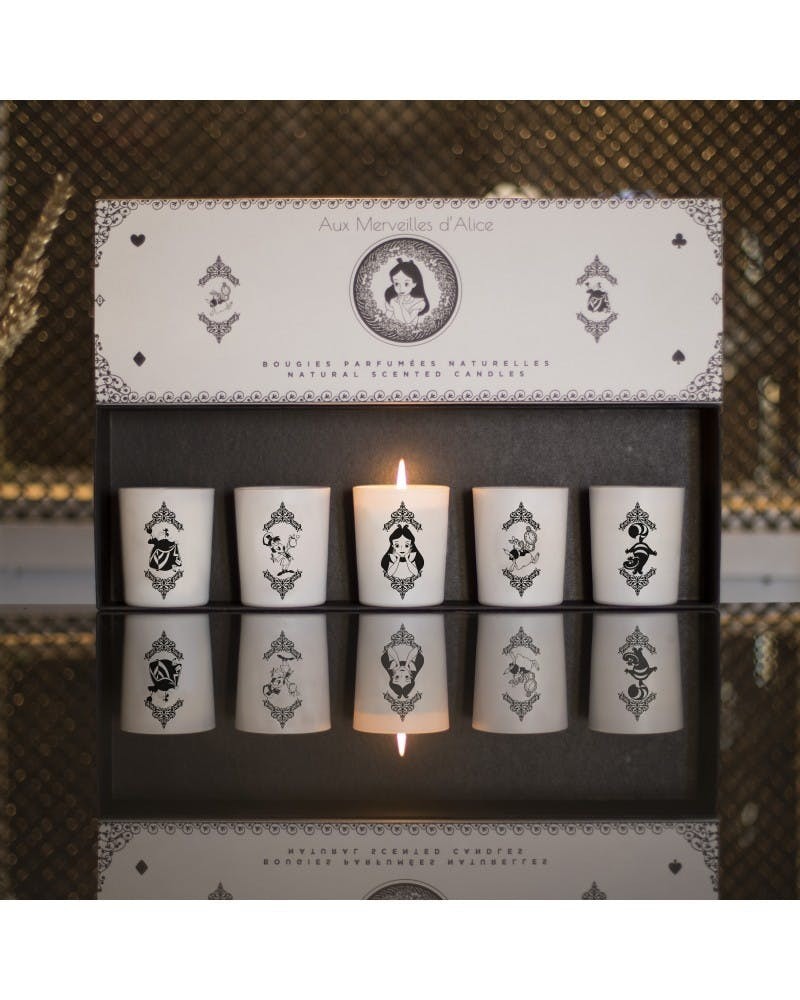Ce coffret contient cinq bougies naturelles parfumées (brioche, fraise-menthe, pain d’épice, guimauve et nuances de thé), avec des personnages issus du monde fantastique d’Alice au Pays des Merveilles.